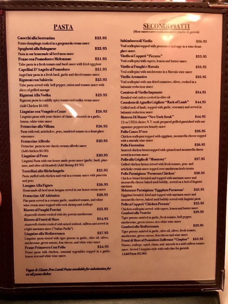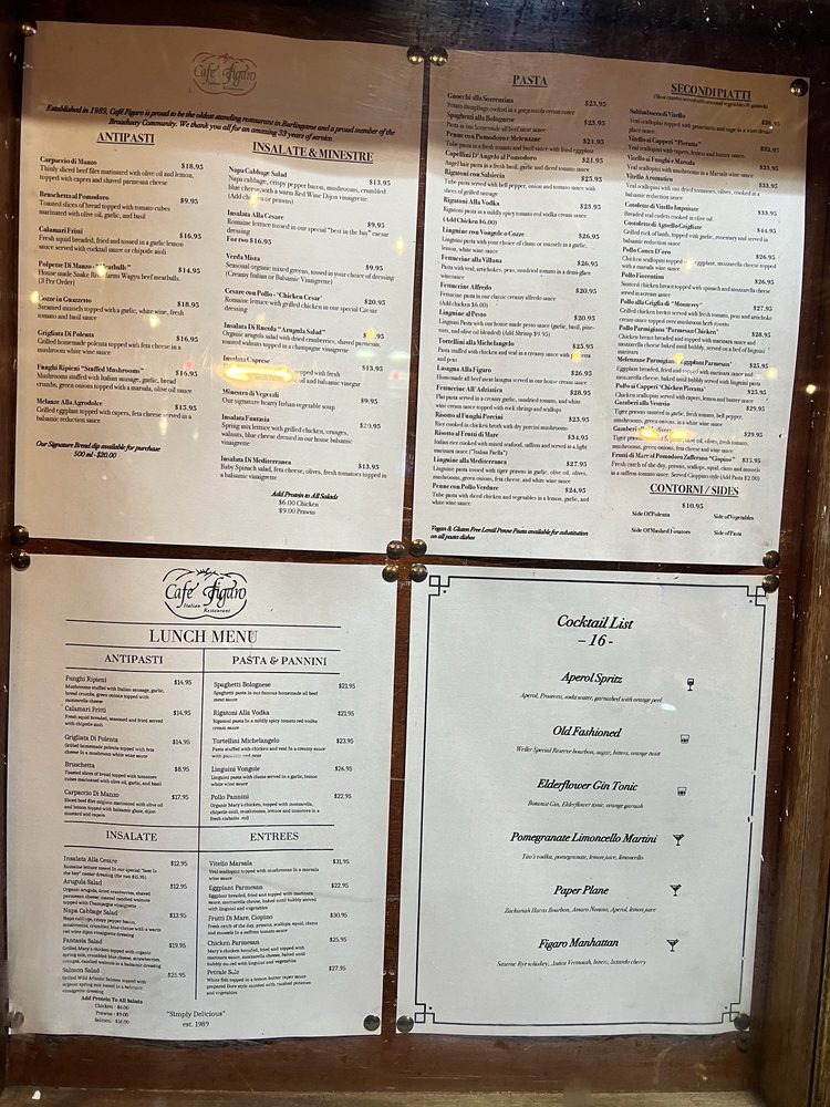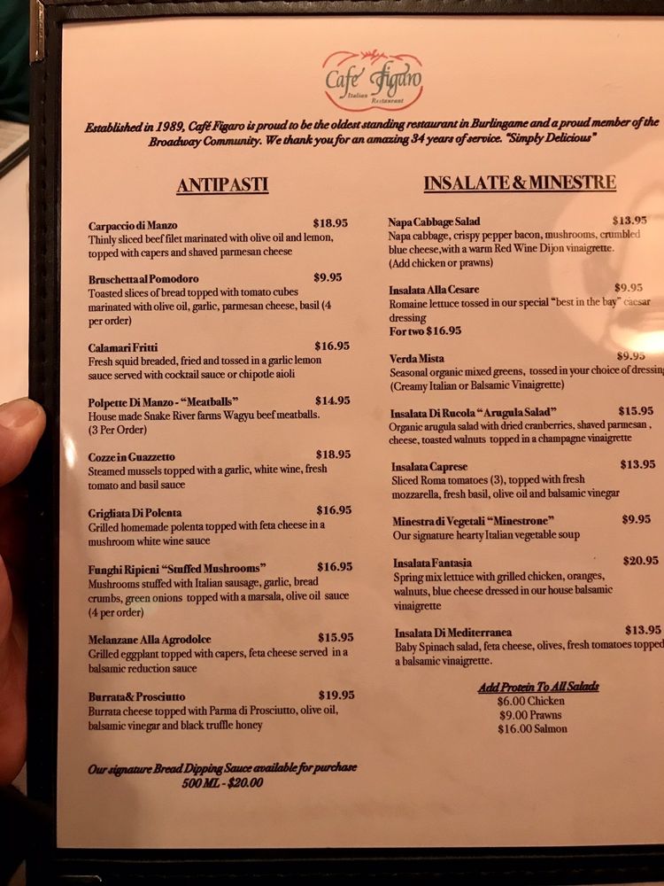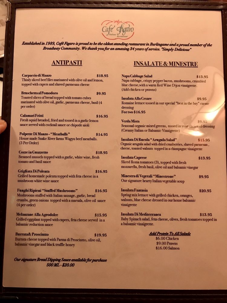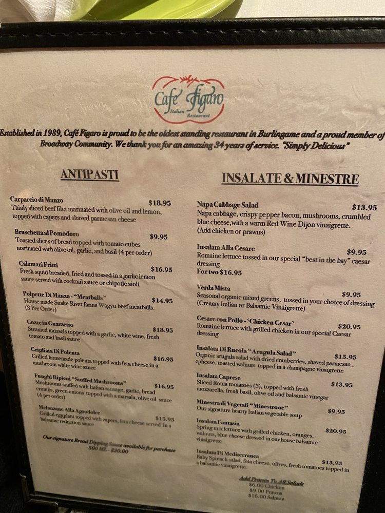 Welcome to Café Figaro, a charming fusion of New American and Italian cuisine nestled in Burlingame, California. With an emphasis on fresh, high-quality ingredients, the menu showcases delightful options that cater to various dietary preferences, including pescatarian and numerous vegetarian dishes. Guests can indulge in house-made pastas like the Penne con pollo verdure, complemented by a thoughtfully curated wine selection by owner Will, setting the tone for an enjoyable dining experience.